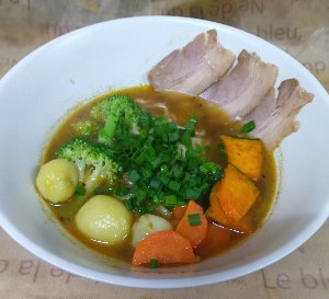 即ち、1 2 3 のスープを合わせ タレとカレー風味の香味脂を合わせたものが当店のカレーラーメンです。 タレは12CC(通常ラーメンは30CC)なので減塩で 化学調味料不使用です。